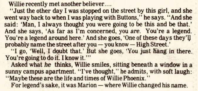The next two excerpts are from a Columbus Monthly article. Here, Willie talks about a Marion band that impressed him.